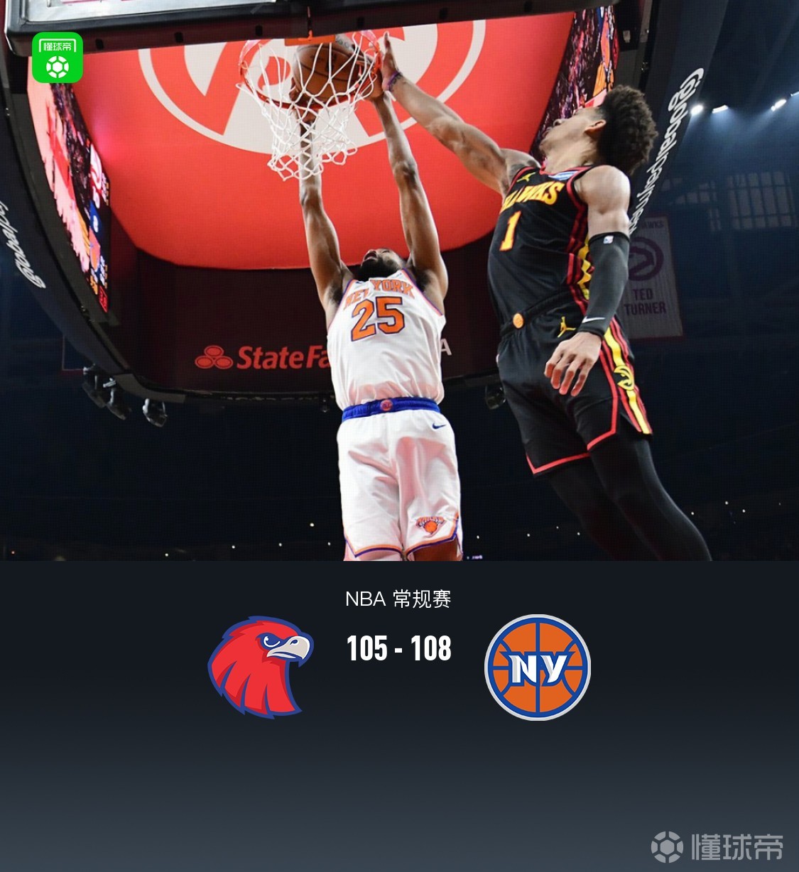 亚特兰大老鹰亚历山大-沃克36分2板3助,杰伦-约翰逊21分11板5助;纽约尼克斯布伦森29分3板13助,OG-阿奴诺比22分5板1助。