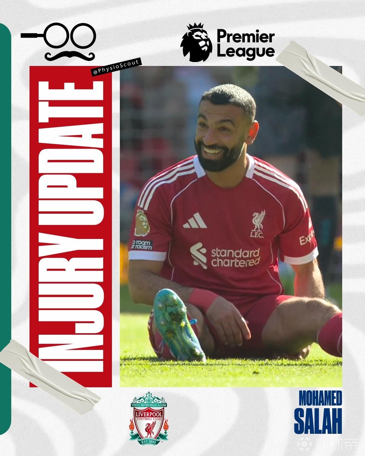 来自埃及国家队阵营的消息称,萨拉赫预计将缺阵一个月。伤情大概率属于一级或二级肌肉拉伤。