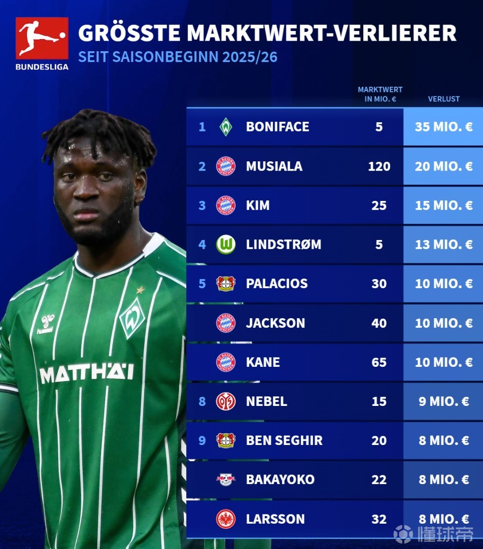 北京时间4月7日,德转列出了2025-26赛季德甲球员的身价降幅榜,去年夏天从勒沃库森租借加盟云达不莱梅的博尼费斯因饱受伤病困扰身价暴跌3500万欧元排名第一,穆西亚拉下跌2000万欧元第二,金玟哉下跌1500万欧元第三。