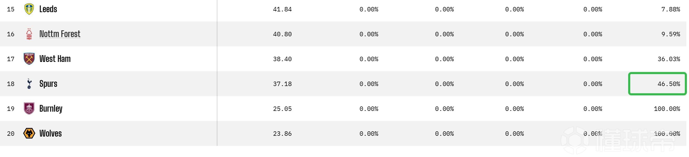 OPTA预测:热刺成英超降级大热门,降级概率已达46.5%