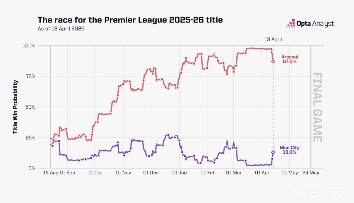 Opta:阿森纳争冠仍有五大乐观理由,模型预测夺冠概率为87%