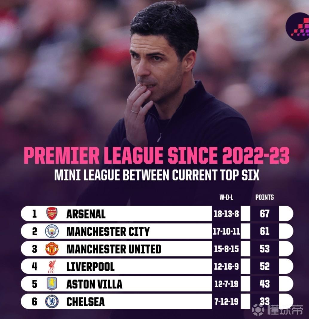 更重要的是,阿尔特塔治下的阿森纳在强强对话中的整体战绩令人印象深刻。过去三个半赛季,在目前排名前六球队的相互交锋中,阿森纳输球最少(39场仅8负),积分最高。如果说存在某种规律,那就是阿森纳往往在预期必胜的比赛中丢分,而非在对阵直接竞争对手时失手。