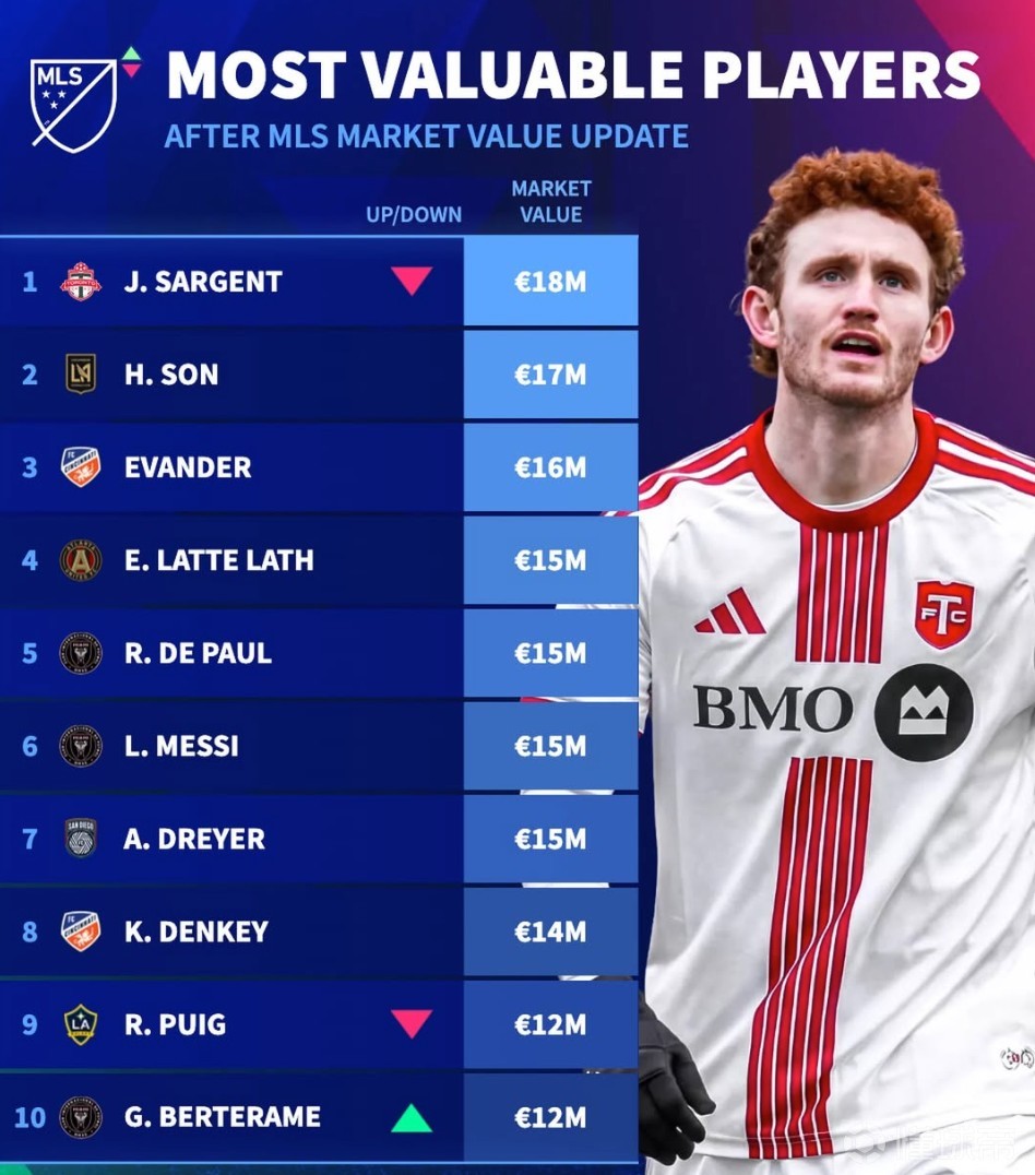 德转更新美职联身价前10:梅西1500万欧第4,孙兴慜1700万第2